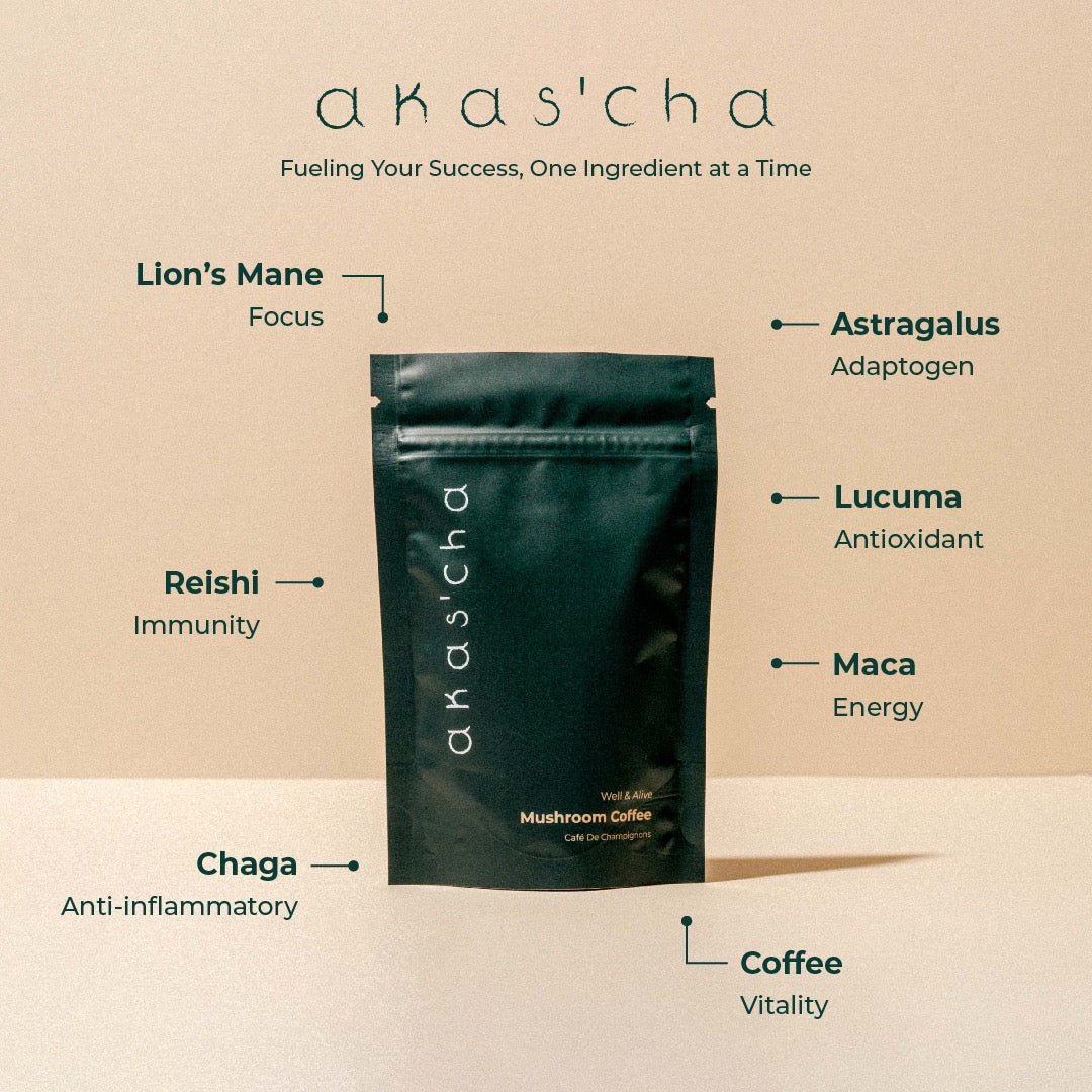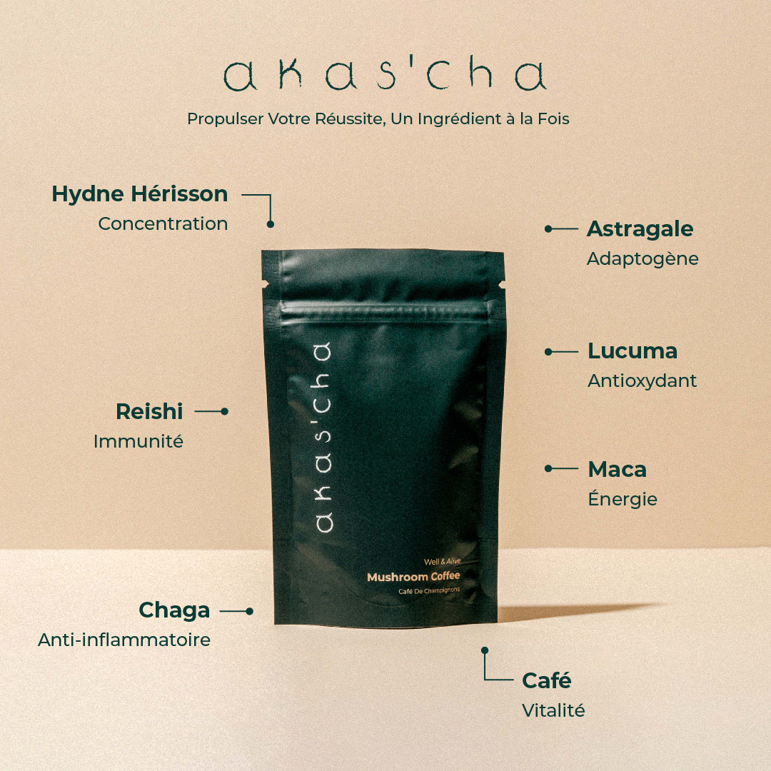 La combinaison de champignons Reishi, Chaga et Hydne Hérisson contribuent au support du système immunitaire et du cerveau alors que la présence de super-aliments — racine de Maca & fruit du Lucuma — nourrissent et équilibrent le corps!